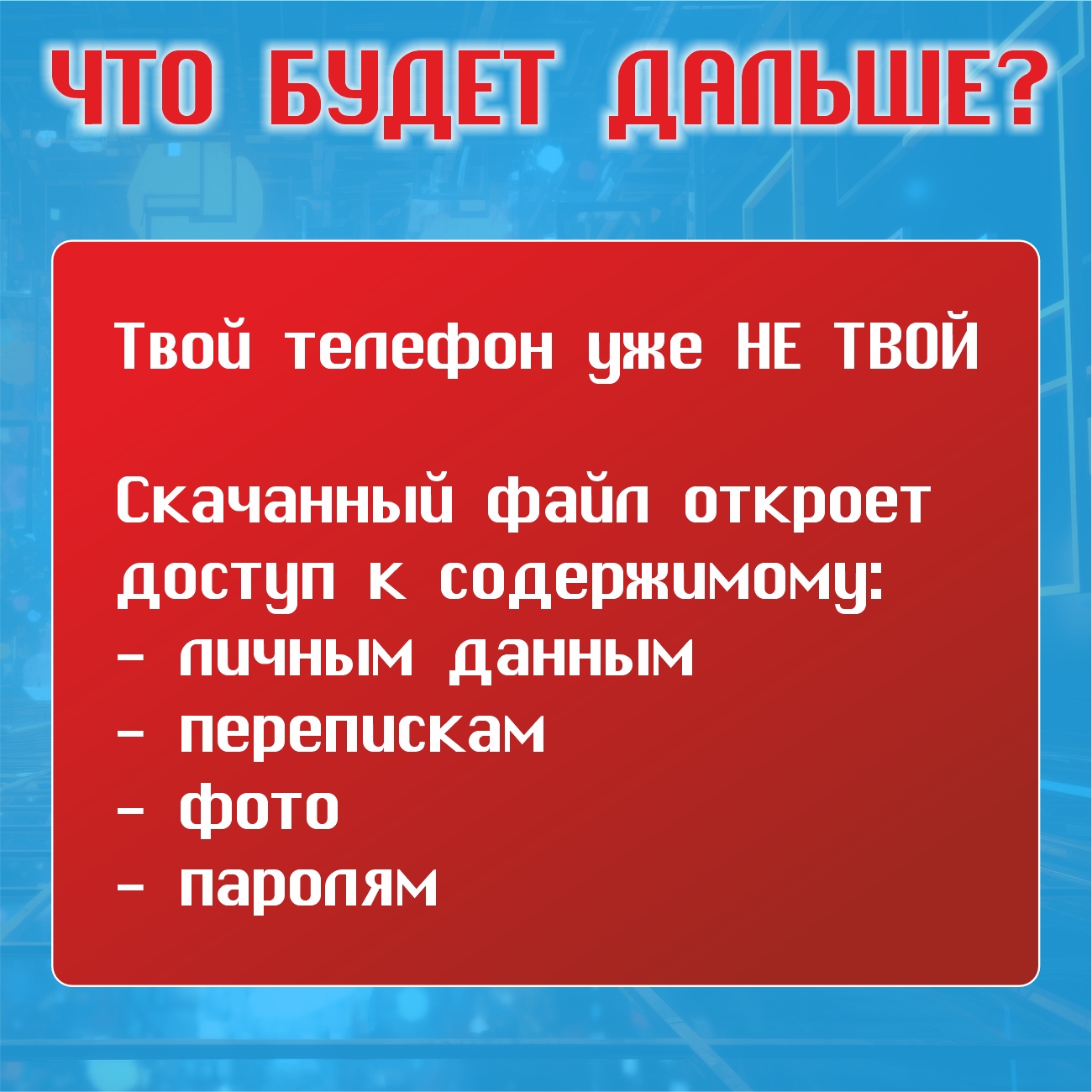 «Тестировщик игр, доход от 5000₽ в день» — звучит как мечта? На деле это схема вербовки, которая ломает жизни. Такие предложения могут обернуться не только хищением денег, но и вербовочной ситуацией. Как предотвратить, что грозит, почему нельзя верить подобным «сказкам» – обо всём этом в информационных карточках. Помните: попытка заработать «лёгкие деньги» может стоить свободы. Не верьте злоумышленникам! Если шантажируют — не молчите! Звоните 102 или 112.