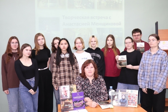 21 ноября в рамках патриотического проекта «Дорогами поколений» в библиотеке им. В.Ф. Потанина для студентов колледжа состоялась творческая встреча с членом Союза писателей России, руководителем литературного клуба «Приют поэтов» А.В. Менщиковой. В ходе встречи Анастасия Викторовна рассказала о детстве и семье, о любви к природе и Родине, а также о воспитании подрастающего поколения. Ребята познакомились с произведениями из трех поэтических сборников: