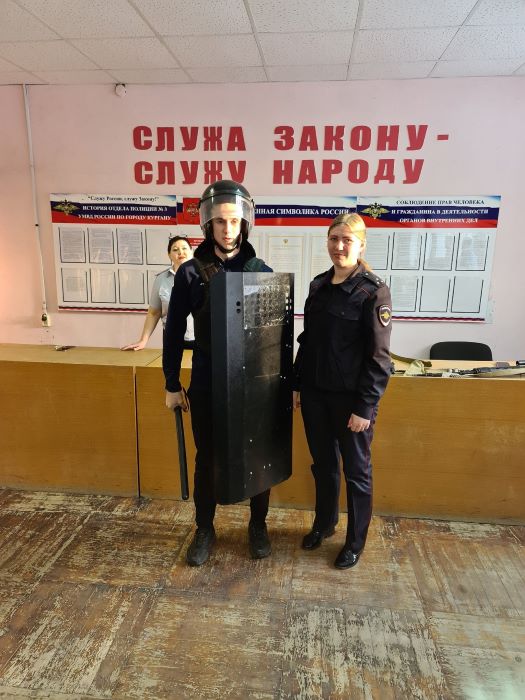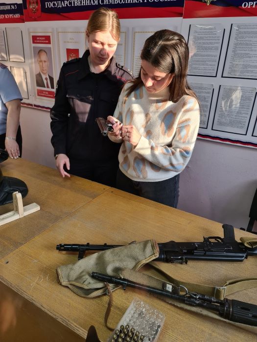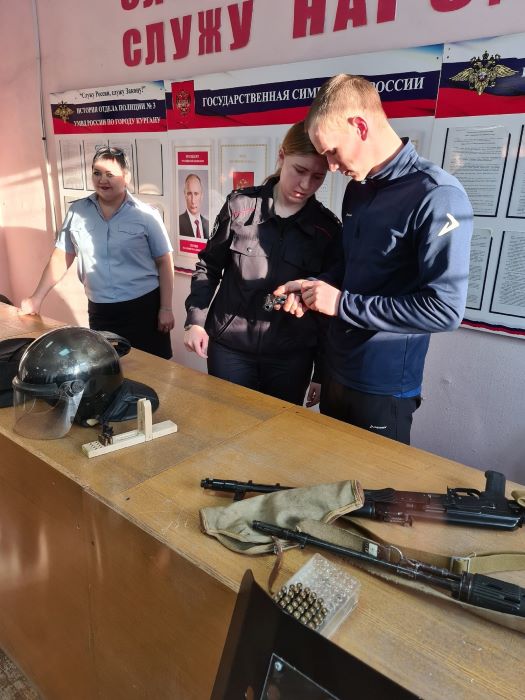 Они предоставили обмундирование полицейских, оружие. Желающие смогли примерить бронежилет, каску, щит и почувствовать тяжесть этих необходимых вещей для каждого сотрудника полиции. Инструктор по оружию показала сборку и разборку пистолета и автомата.