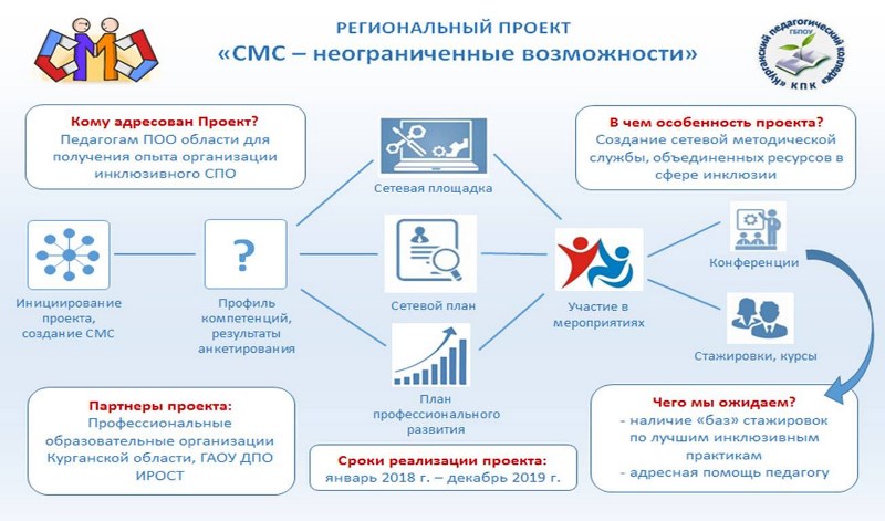 С марта 2018 года профессиональные образовательные организации нашей области включились в реализацию проекта «Разработка механизма управления профессиональными компетенциями педагогов на базе БПОО Курганской области» или «СМС — неограниченные возможности».