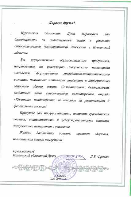 11 мая 2018 года на торжественном открытии V региональной выставки - форума «Дети Зауралья – заботимся вместе!» председатель Курганской областной Думы Фролов В.Д. вручил директору ГБПОУ «Курганский педагогический колледж» Л.Г. Бобковой Благодарственное письмо Курганской областной Думы за значительный вклад в развитие добровольческого (волонтерского) движения в Курганской области.