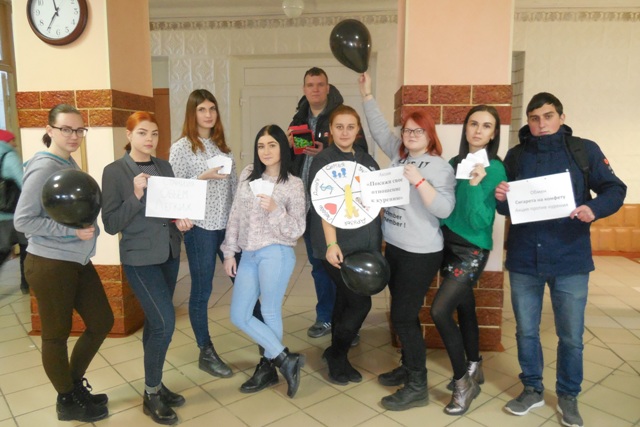 Да и вообще, сигареты и педагог – вещи несовместимые. Поэтому студенты 45 группы провели акции, приуроченные к Международному дню отказа от курения. Все желающие фотографировались с креативным плакатом, повязывали ленточки соответствующих цветов на запястья, соревновались в надувании воздушных шаров, угощались конфетами, отвечали на вопросы экспресс-анкеты.