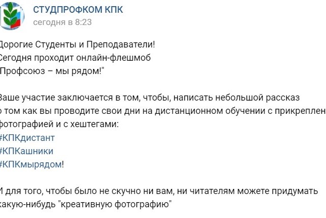 Условия флешмоба были следующими: необходимо написать Вконтакте небольшой рассказ о том, как проходит дистанционное обучение, прикрепить к тексту фото и хештеги #КПКдистант #КПКашники #КПКмырядом!