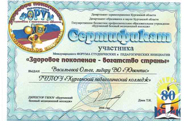 7 апреля в Курганском базовом медицинском колледже состоялся Международный Форум студенческих и педагогических инициатив «Здоровое поколение – богатство страны», в котором приняли участие Малахова А. (ССК «Олимп»), Коркина К. (ВО «Ювентис») и Васильева О. (ВО «Ювентис»). По итогам конкурса в номинации «Защита социальных проектов» Васильева О. заняла 3 место, в номинации «Стендовый доклад» Коркина К. - 1 место. Благодарности получили и руководители: Светочева Н.А., Морковских Д.С. и Коновалова Е.В. Поздравляем!