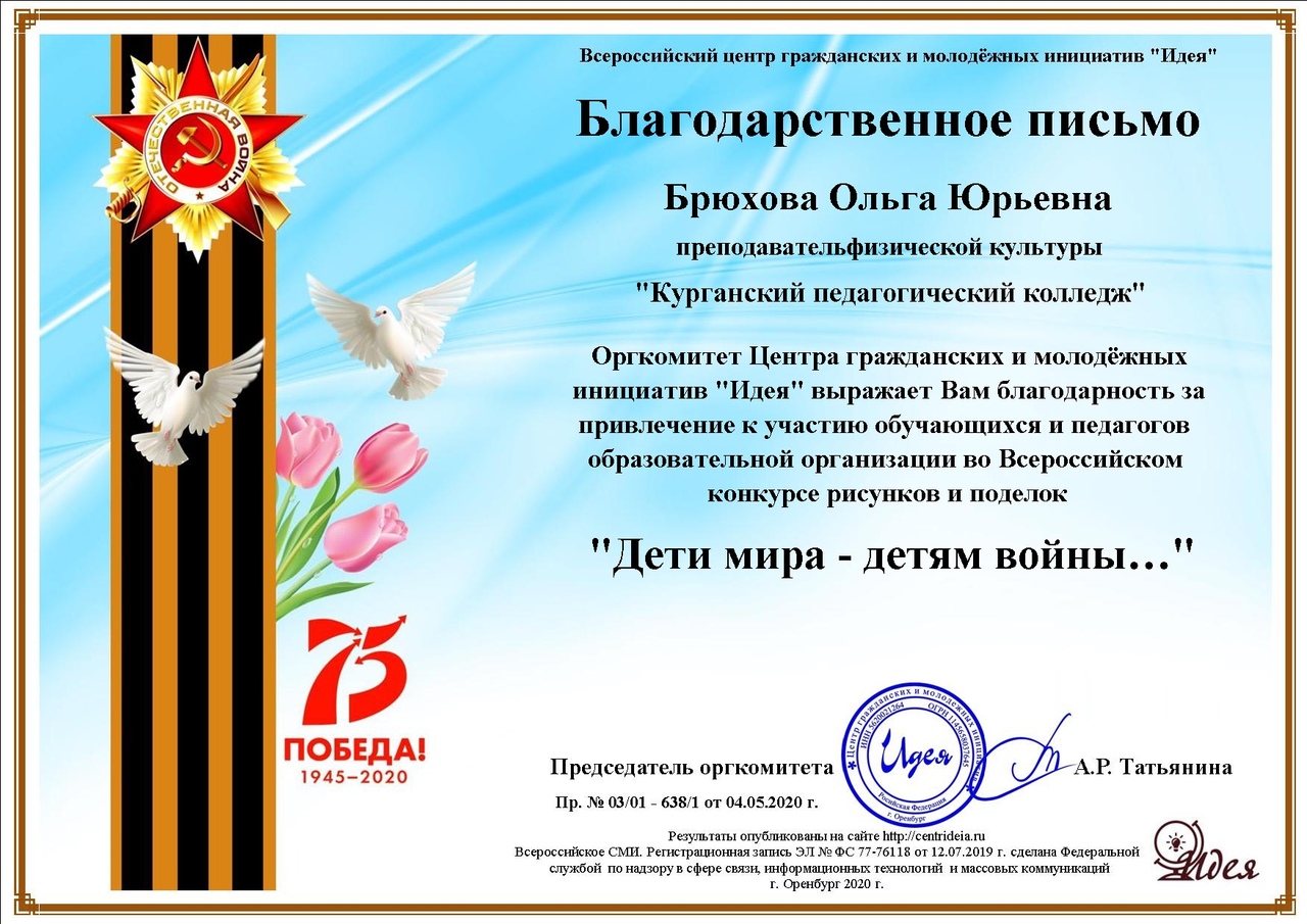 Студенты 10 группы Смирнов С. и Захарова В. приняли участие во Всероссийском конкурсе рисунков и поделок «Дети мира – детям войны...» и заняли дипломы I степени. Евдокимова Е. и куратор Брюхова О.Ю. приняли участие во Всероссийском конкурсе чтецов, посвященном 75-летию Победы в Великой Отечественной войне «Живое слово о войне», где также получили дипломы I и II степени. Поздравляем!