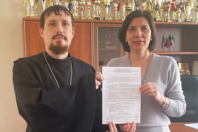 Состоялось подписание соглашения о сотрудничестве между Курганским педагогическим колледжем, в лице директора образовательной организации Любови Григорьевны Бобковой, и Местной религиозной организацией «Приход Благовещения Пресвятой Богородицы г. Курган Курганской Епархии Русской Православной Церкви (Московский Патриархат)», в лице настоятеля иерея Дмитрия Владиславовича Жернакова.