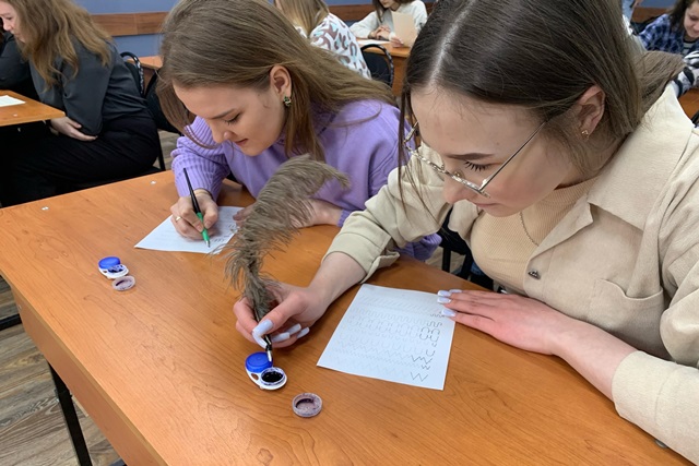 Студенты отгадывали загадки по истории нашего города, прошли квест по помещениям исторического здания библиотеки, читали рассказы, напечатанные старинным шрифтом, писали и рисовали чернильными перьями. Завершилась встреча интерактивной выставкой по истории города в специальных очках и беседой на актуальные темы посвящения, воспитания и дальнейшего сотрудничества с организаторами встречи.